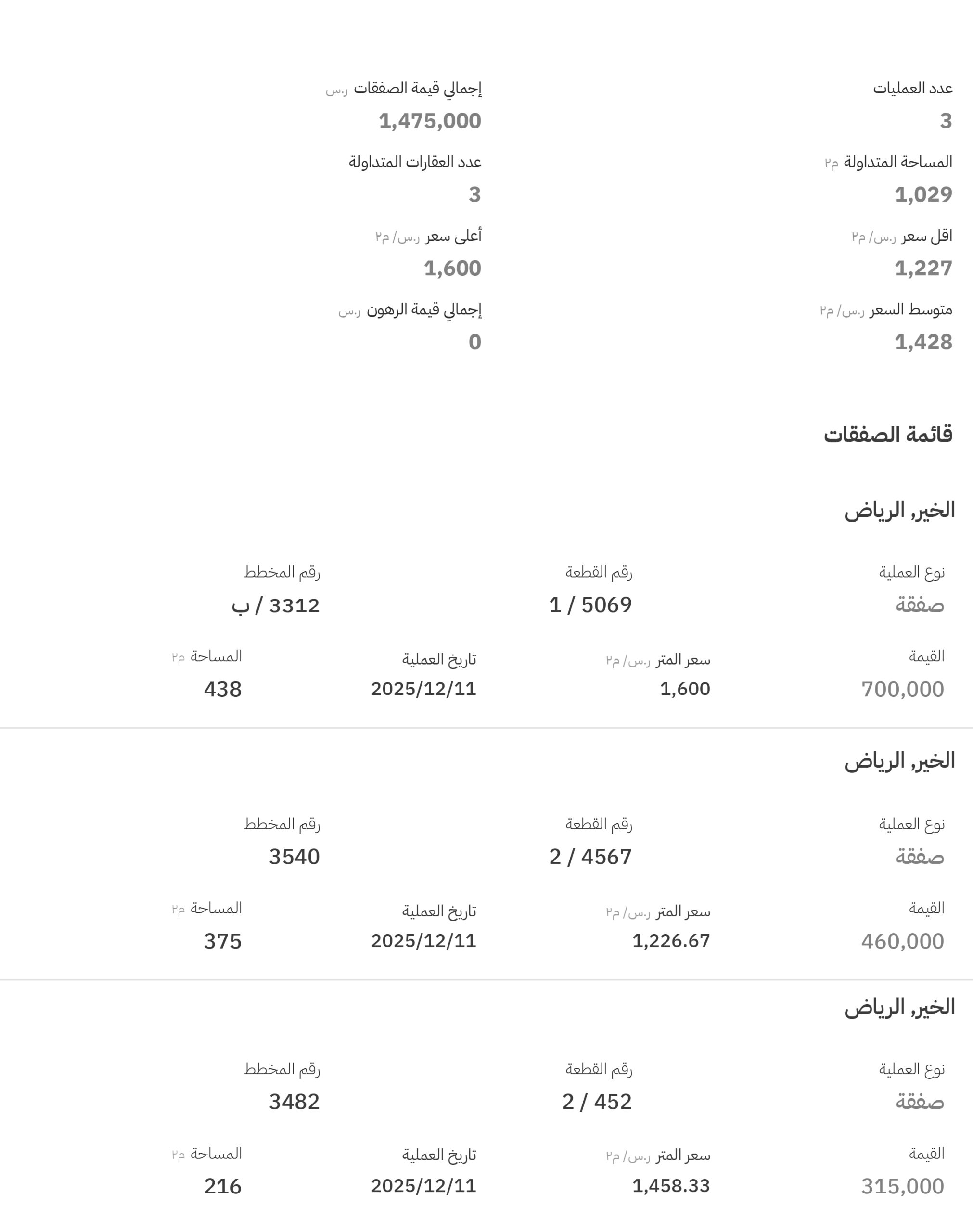فيما شهدت مخططات الخير تنفيذ 3 صفقات، وبلغ أعلى سعر فيها 1600 ريال للمتر المربع في مخطط رقم (3312 / ب)، قطعة رقم (5069 / 1).