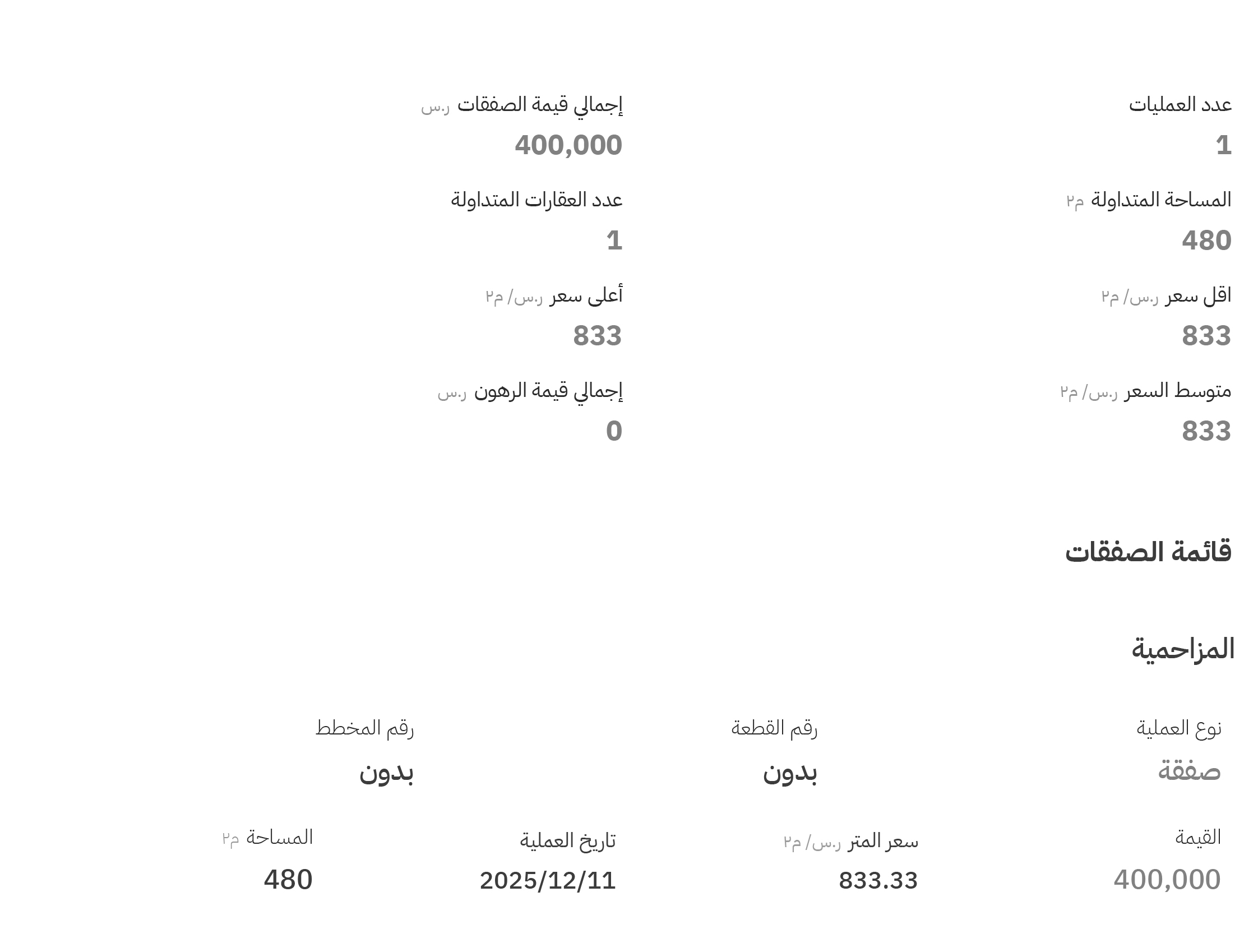 وفي مخططات المزاحمية تم تسجيل بـ 3 صفقات، وبلغ أعلى سعر فيها 833 ريالاً للمتر المربع، في مخطط رقم (بدون)، قطعة رقم (بدون).