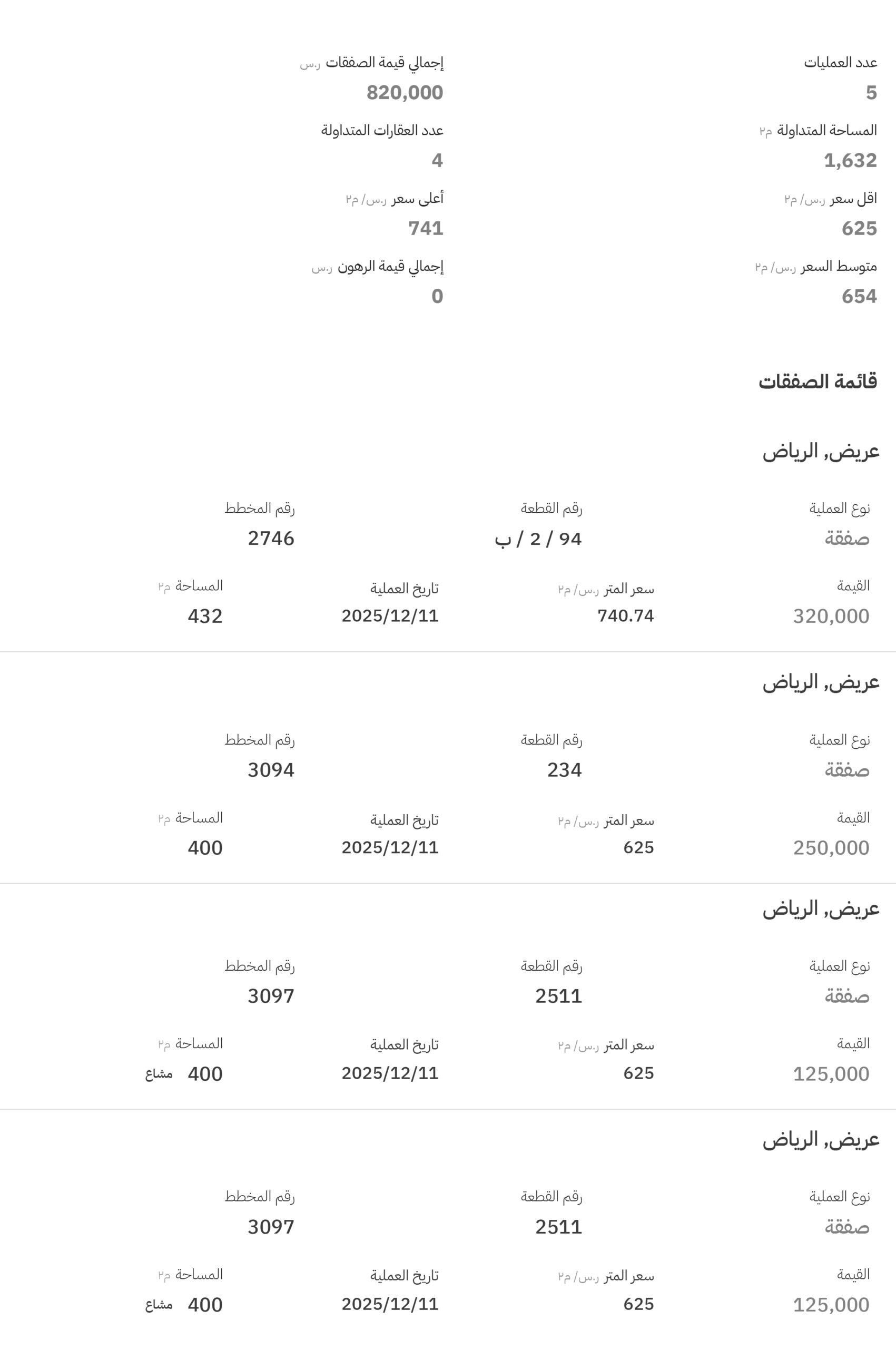 أما حي عريض فقد سجل 4 صفقات عقارية، وبلغ أعلى سعر فيها 741 ريالاً للمتر المربع، في مخطط رقم (2746)، قطعة رقم (94 / 2 / ب).