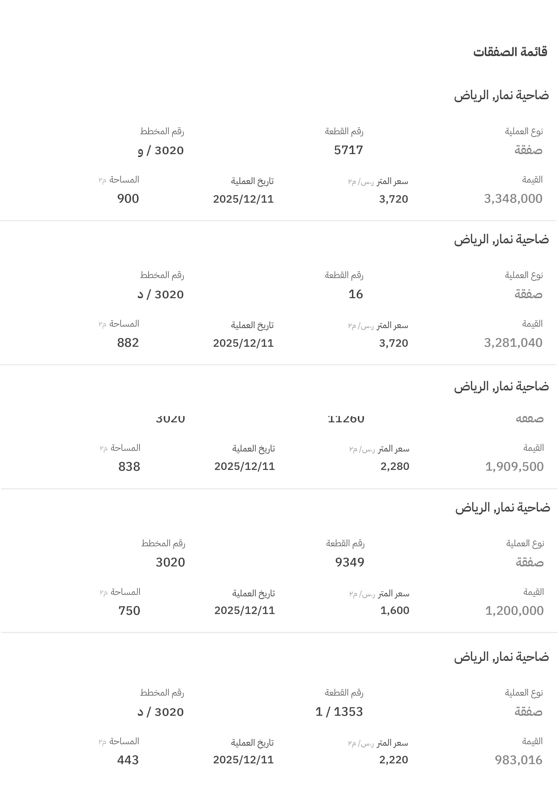 وجاءت مخططات نمار (3020) في صدارة التداولات بـ 9 صفقات، وبلغ أعلى سعر فيها 3720 ريالاً للمتر المربع، في مخطط رقم (3020 / و)، قطعة رقم (5717)، وفي مخطط (3020 / د)، قطعة رقم (16).