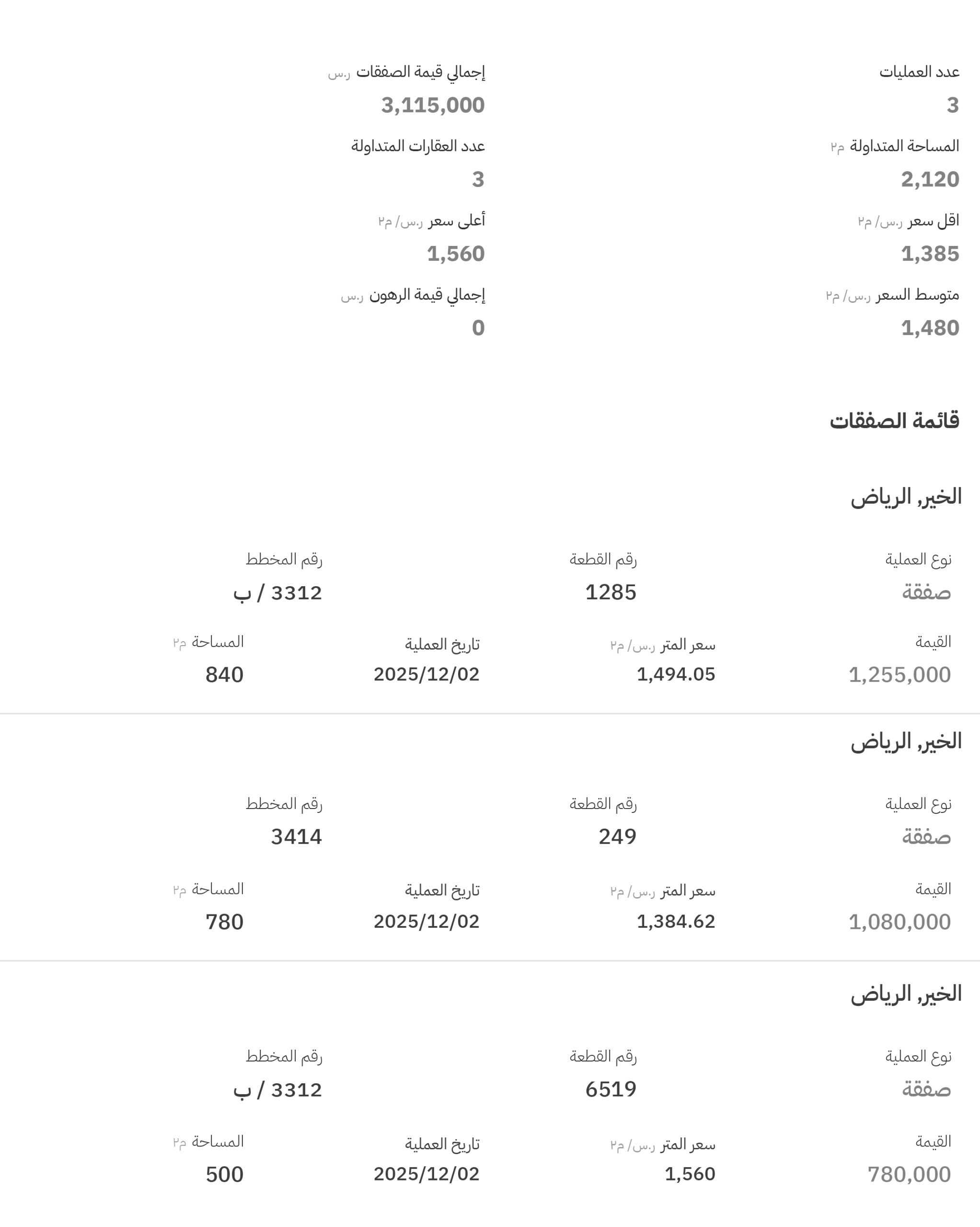 فيما شهدت مخططات الخير تنفيذ 3 صفقات، وبلغ أعلى سعر فيها 1560 ريالًا للمتر المربع في مخطط رقم (3312 / ب)، قطعة رقم (6519).