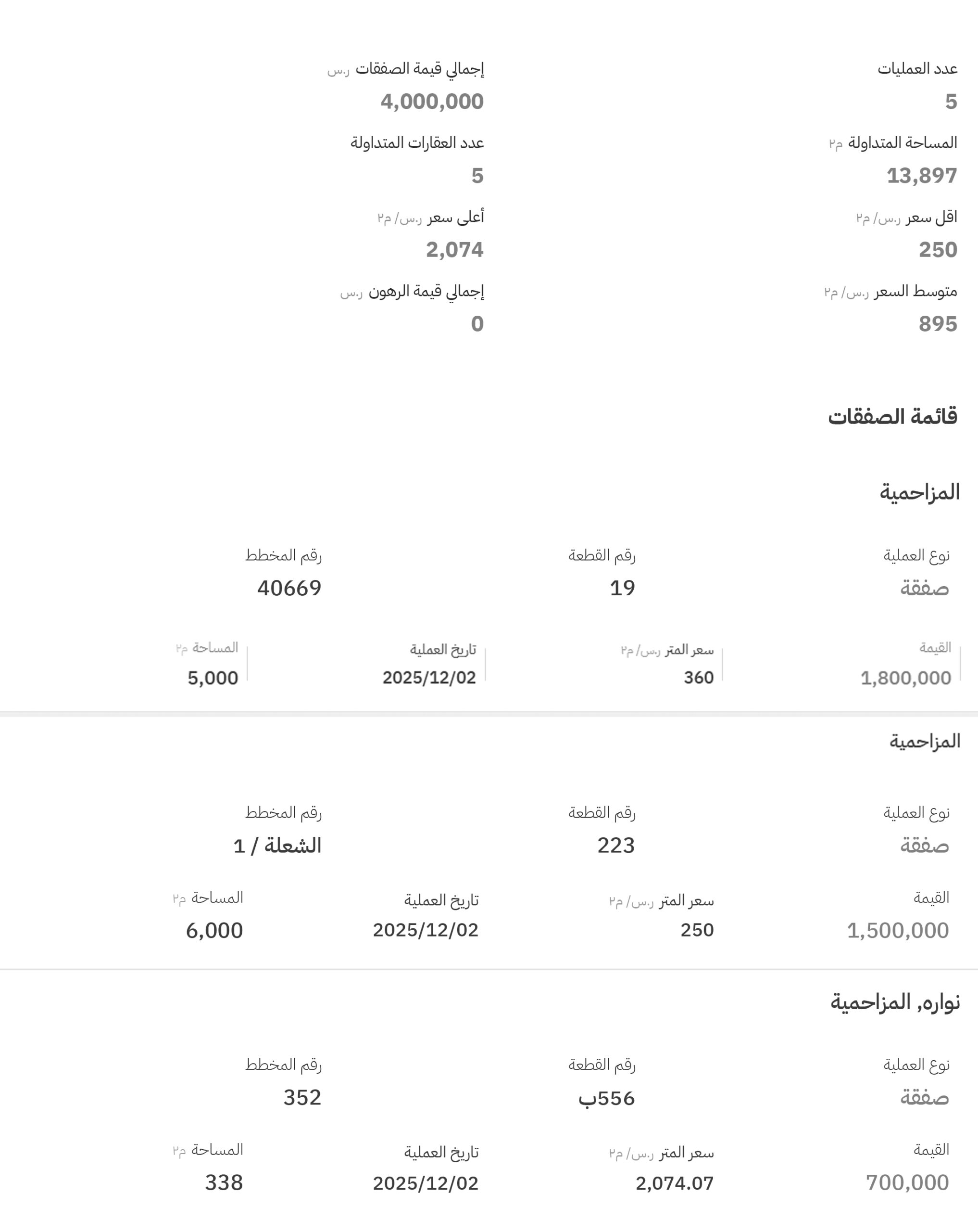 وجاءت مخططات المزاحمية في صدارة التداولات بـ 5 صفقات، وبلغ أعلى سعر فيها 2074 ريالًا للمتر المربع، في مخطط رقم (352)، قطعة رقم (556 / ب).
