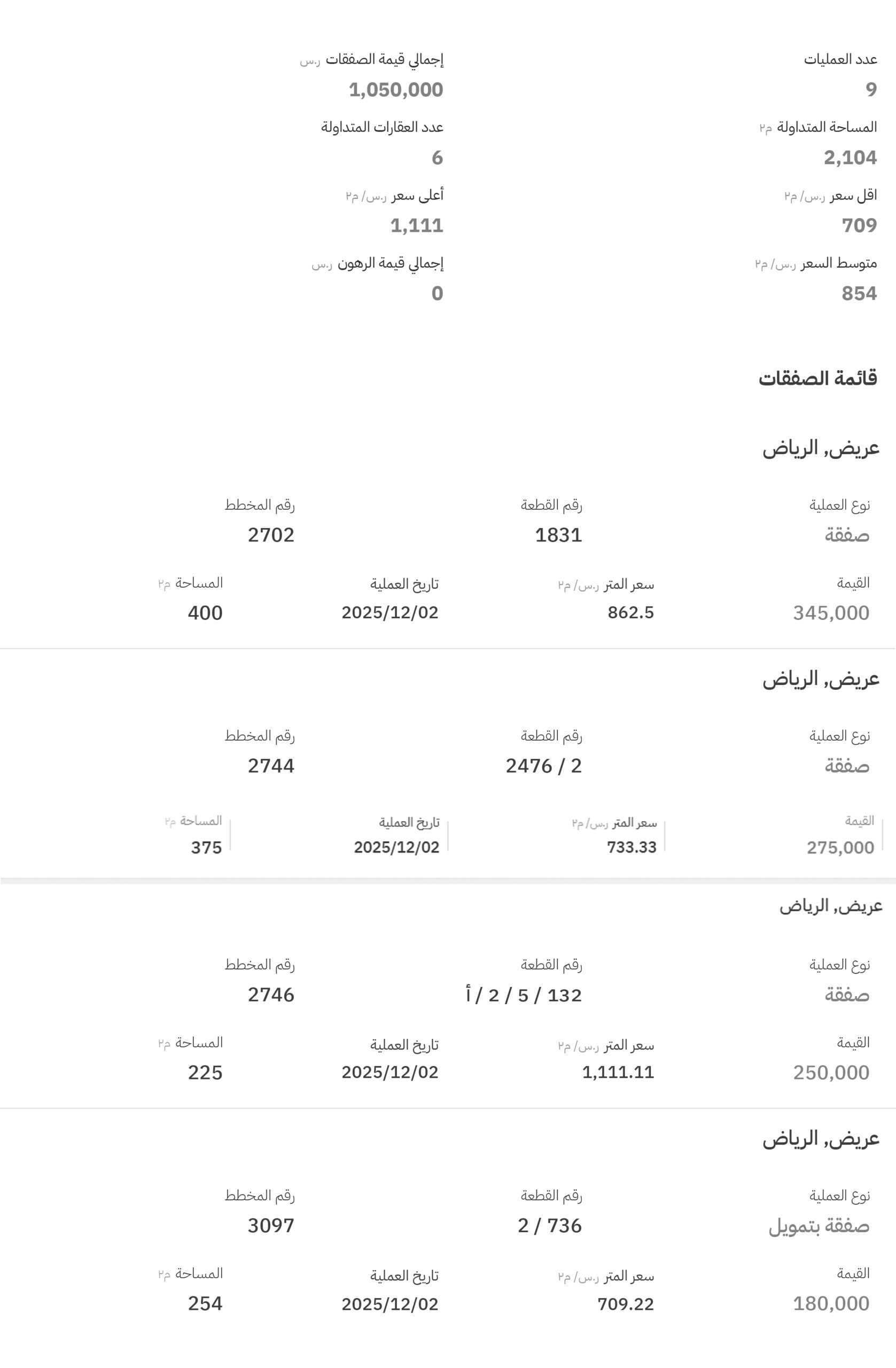 وفي حي عريض تم تسجيل 4 صفقات، وبلغ أعلى سعر فيها 1111 ريالاً للمتر المربع، في مخطط رقم (2746)، قطعة رقم (132 / 5 / 2 / أ)، وفقًا لبيانات البورصة العقارية.