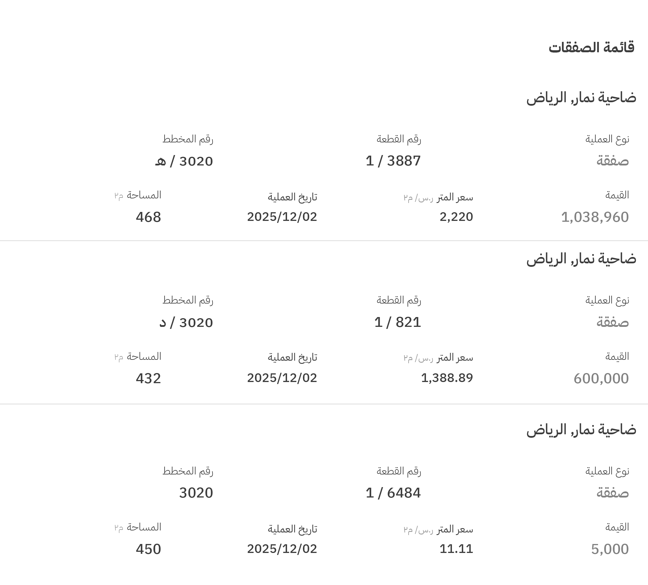 وفي مخططات نمار (3020) تم تسجيل 3 صفقات، وبلغ أعلى سعر فيها 2220 ريالاً للمتر المربع، في مخطط رقم (3020 / هـ)، قطعة رقم (3887 / 1).