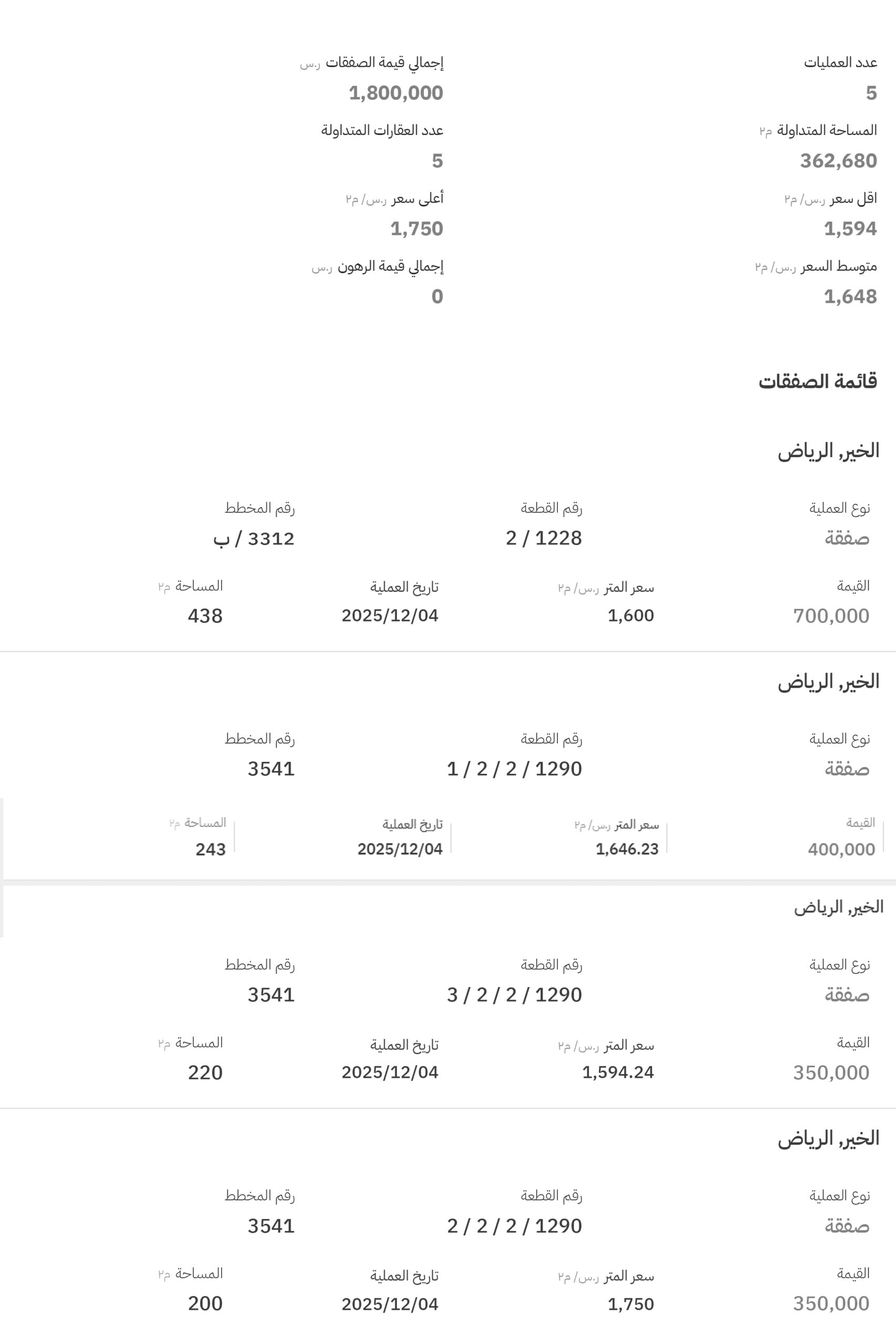 فيما شهدت مخططات الخير تنفيذ 4 صفقات، وبلغ أعلى سعر فيها 1750 ريالًا للمتر المربع في مخطط رقم (3541)، قطعة رقم (1290 / 2 / 2 / 2).