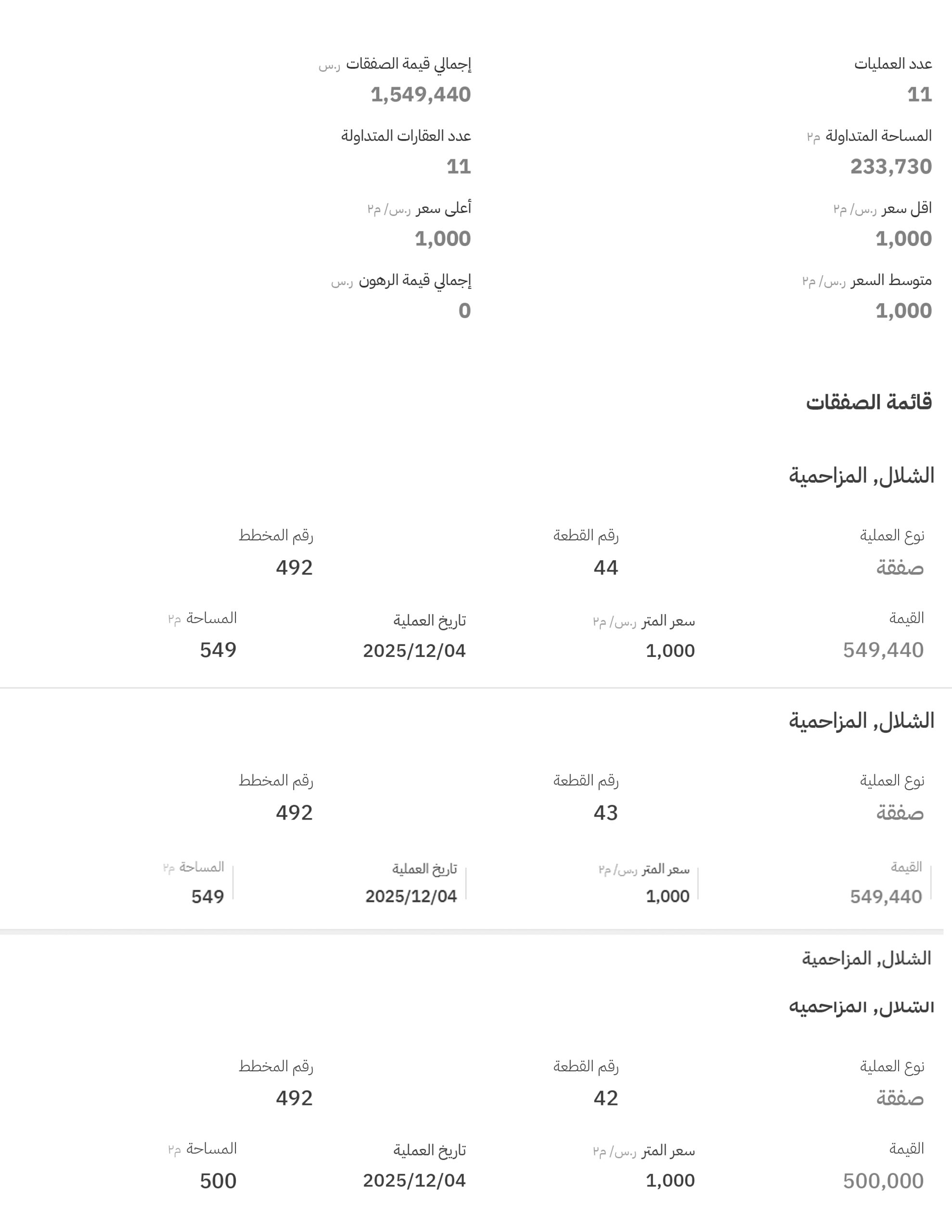 وجاءت مخططات المزاحمية في صدارة التداولات بـ 7 صفقات، وبلغ أعلى سعر فيها 1000 ريال للمتر المربع، في مخطط رقم (492)، قطعة رقم (44).