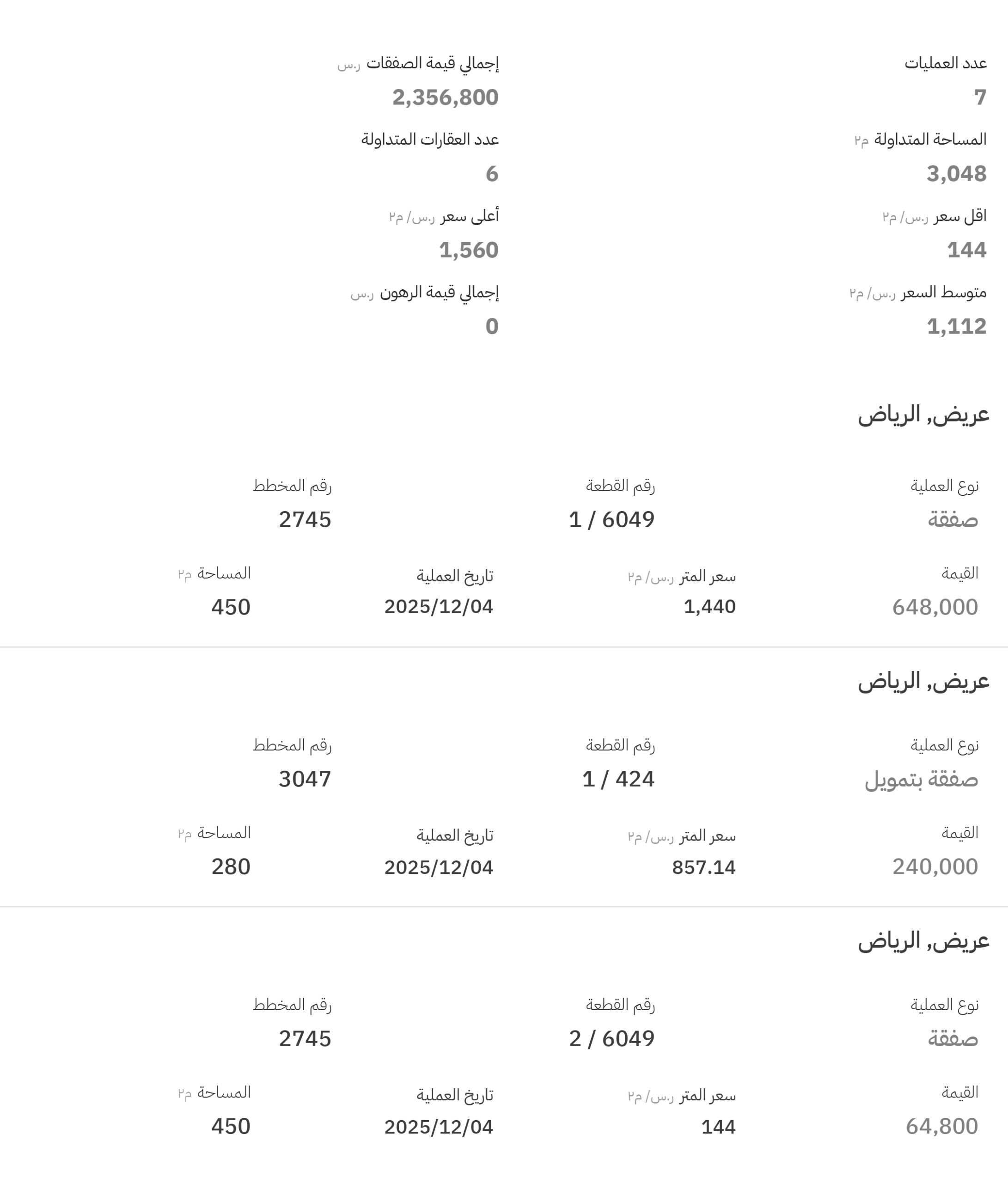 وبالنسبة لـ حي عريض فقد سجل 3 صفقات، وبلغ أعلى سعر فيها 1440 ريالاً للمتر المربع، في مخطط رقم (2745)، قطعة رقم (6049 / 1).