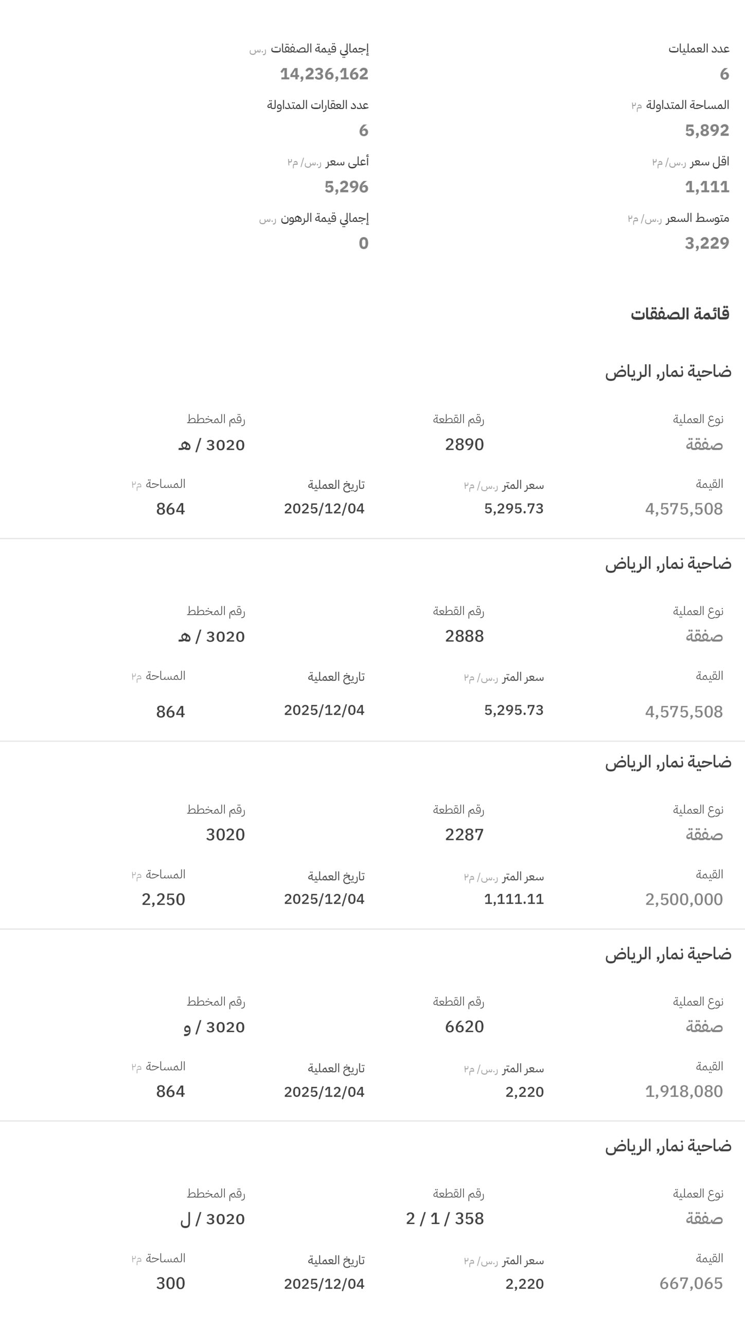 وفي مخططات نمار (3020) تم تسجيل 5 صفقات، وبلغ أعلى سعر فيها 5296 ريالاً للمتر المربع، في مخطط رقم (3020 هـ)، قطعة رقم (2888).