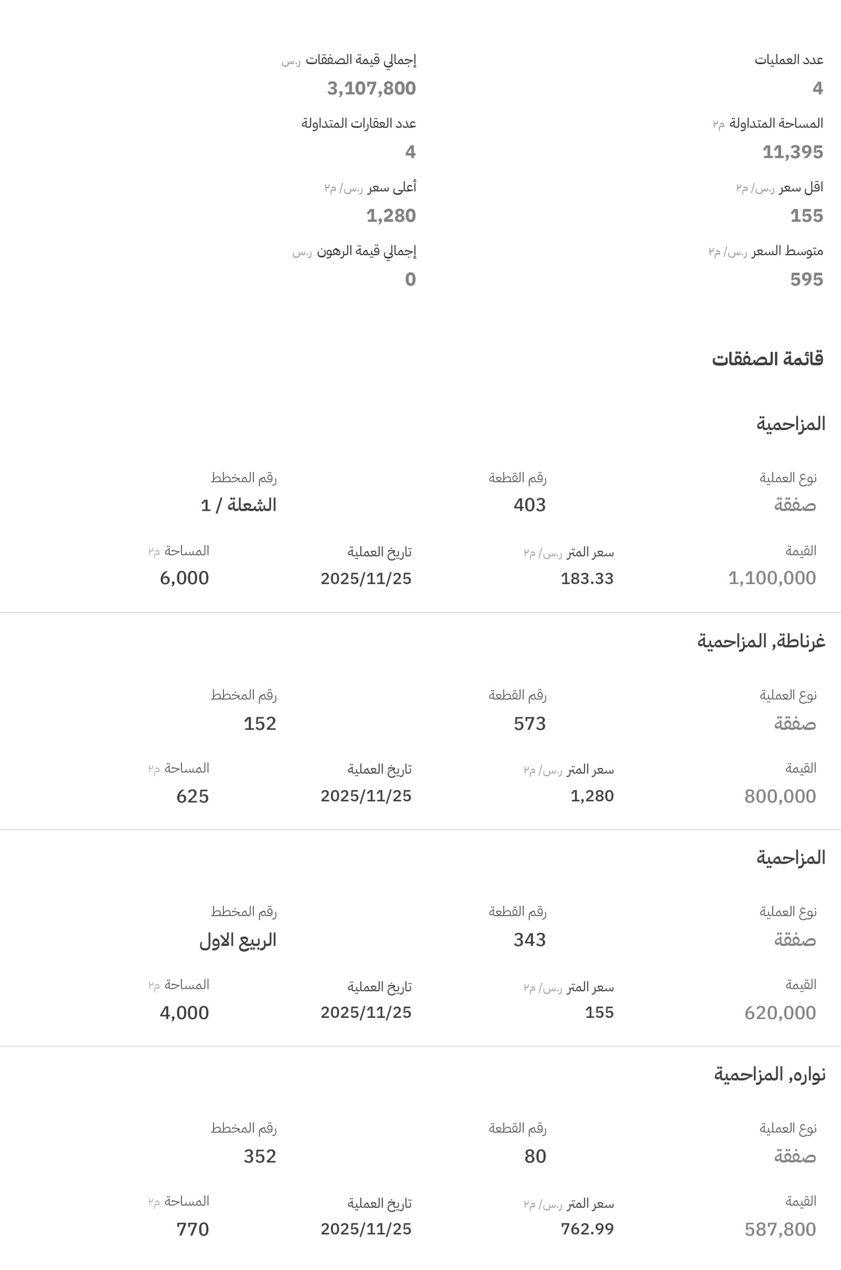 وجاءت مخططات المزاحمية (السكني والزراعي) في صدارة التداولات بـ 6 صفقات، مسجلةً أعلى سعر بلغ 1280 ريالًا للمتر المربع، في مخطط رقم (152)، قطعة رقم (573).