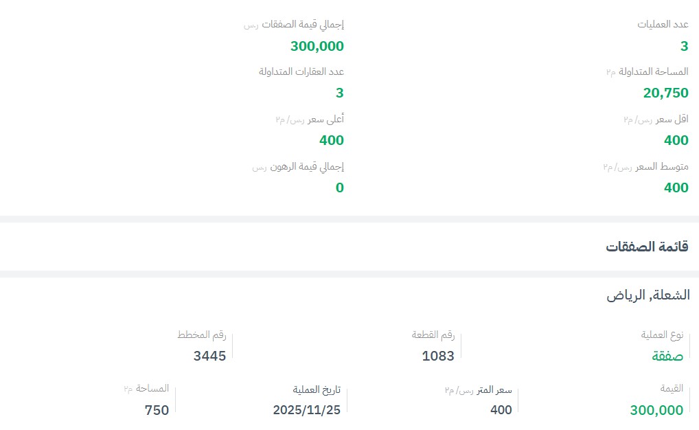 وفي مخطط شرق الرياض تم تسجيل صفقة واحدة، مع أعلى سعر بلغ 400 ريال للمتر المربع، في مخطط رقم (3445)، قطعة رقم (1083).
