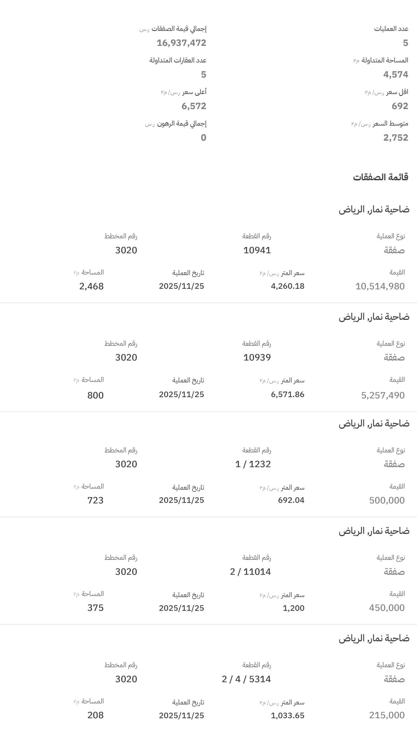 فيما شهدت مخططات نمار (3020) تنفيذ 5 صفقات، وبلغ أعلى سعر فيها 6572 ريالًا للمتر المربع في مخطط رقم (3020)، قطعة رقم (10939).