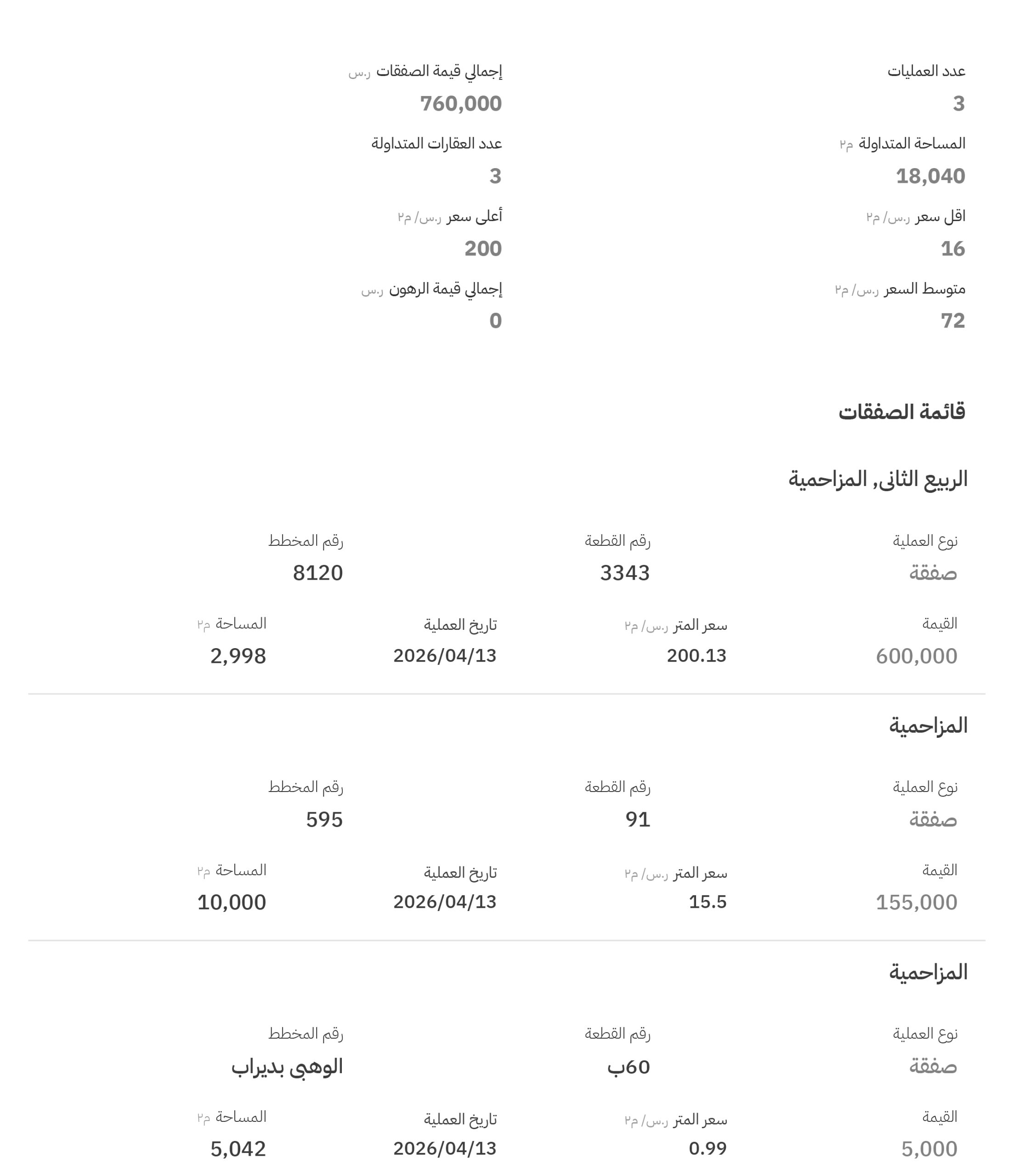 وفي مخططات المزاحمية تم تسجيل 3 صفقات عقارية، وجاء ترتيبها على النحو التالي: