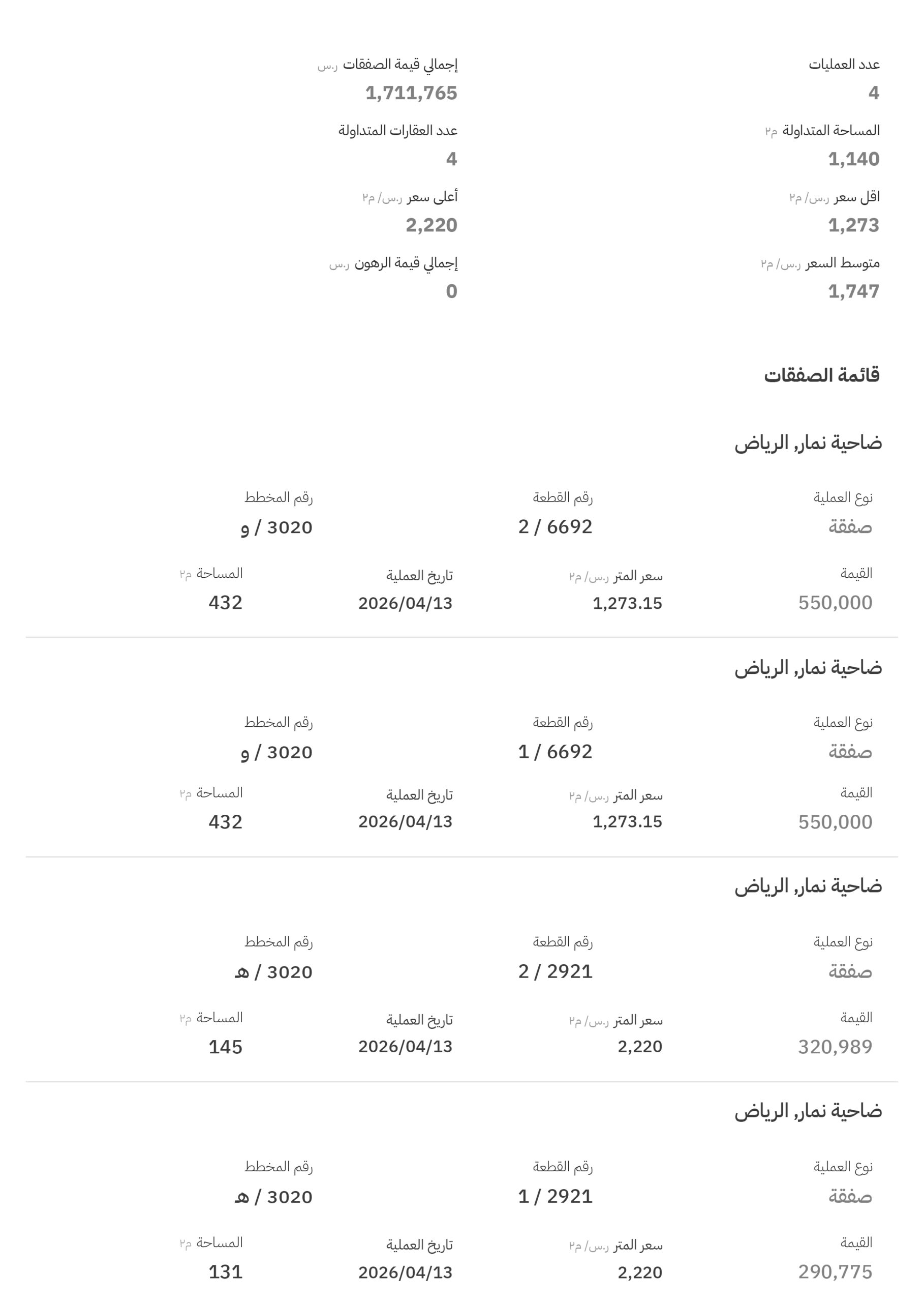سجلت مخططات نمار 3020 تنفيذ 4 صفقات عقارية، وجاءت ترتيب أعلى ثلاث منها على النحو التالي: