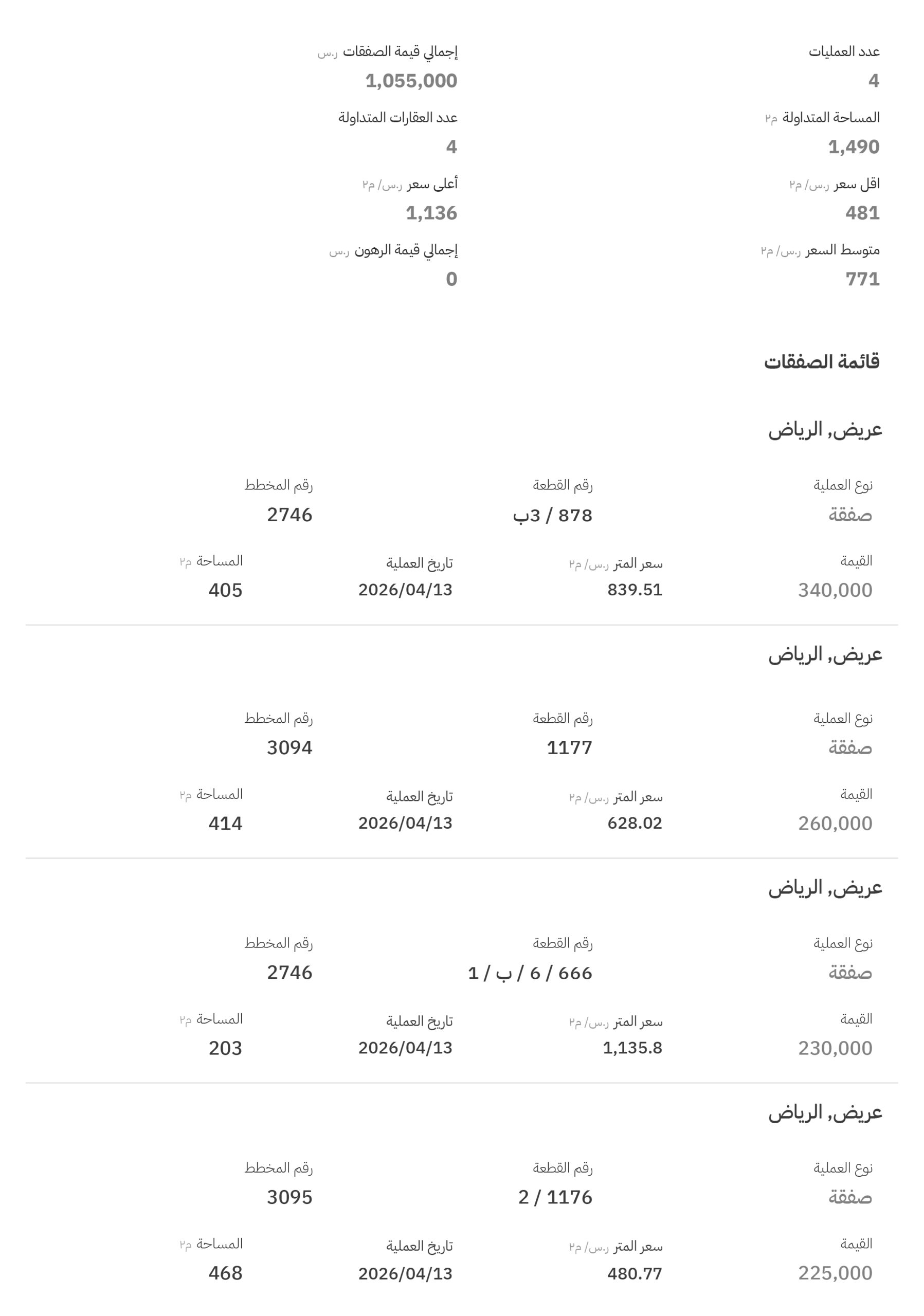 حقق المخطط رقم (2746)، القطعة رقم (666 / 6 / ب / 1)، أعلى سعر للمتر المربع عند 1136 ريالاً، بمساحة 203 أمتار مربعة، لتصل قيمة الأرض إلى 230.000 ريال.