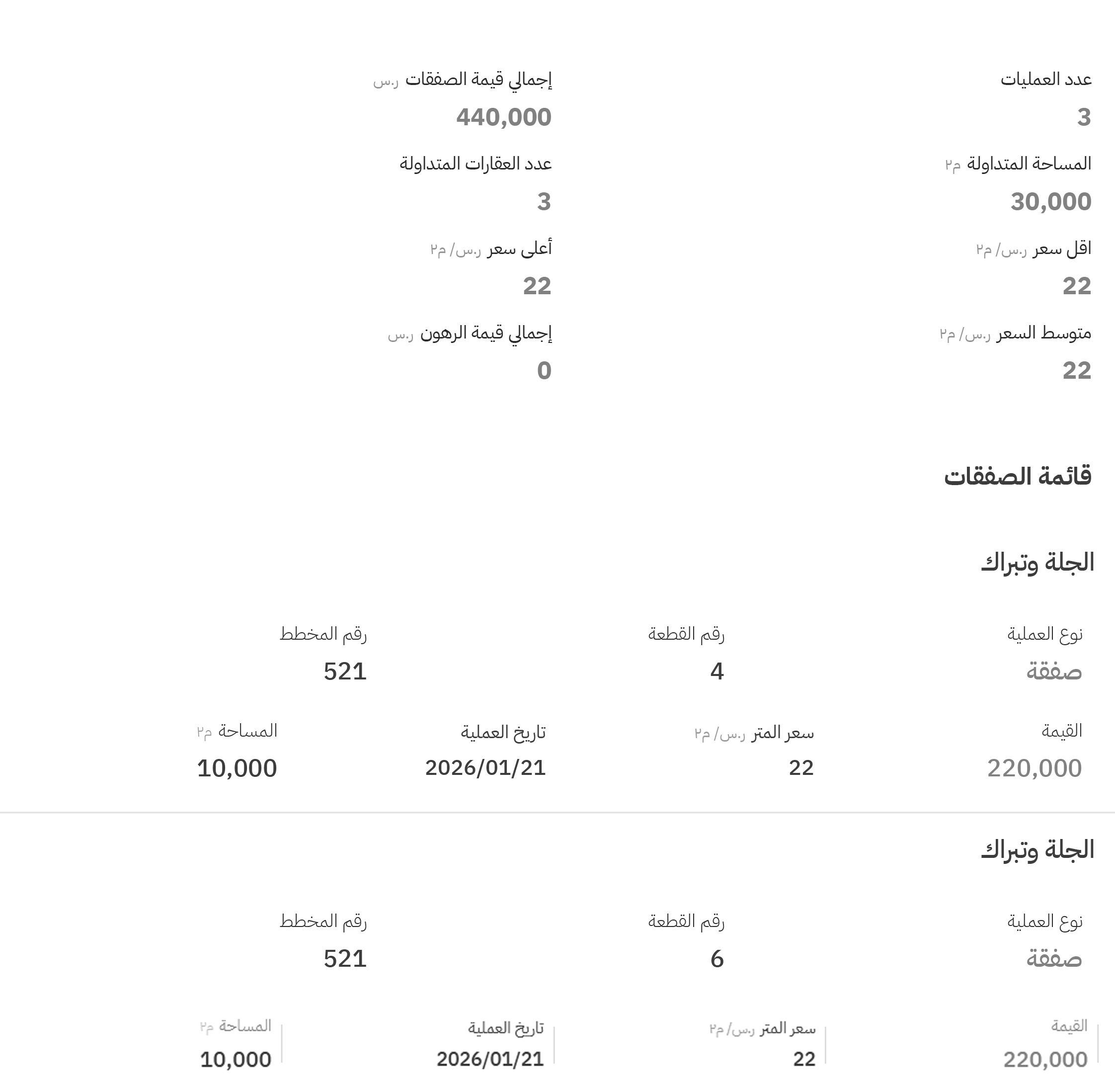 وجاء ثانيًا المخطط رقم (521)، القطعة رقم (4)، بسعر 22 ريالاً للمتر المربع (الجلة وتبراك).