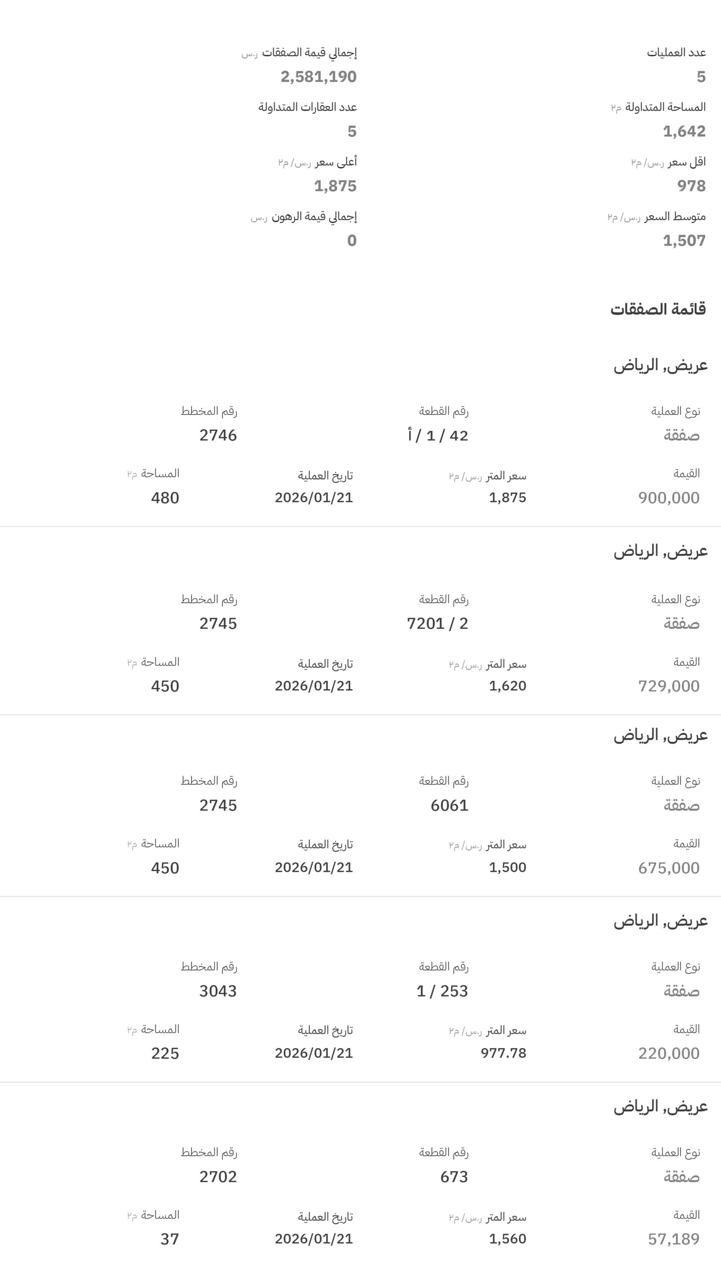 شهدت مخططات حي عريض تنفيذ 5 صفقات عقارية، وجاء ترتيب أعلى ثلاث منها على النحو التالي: