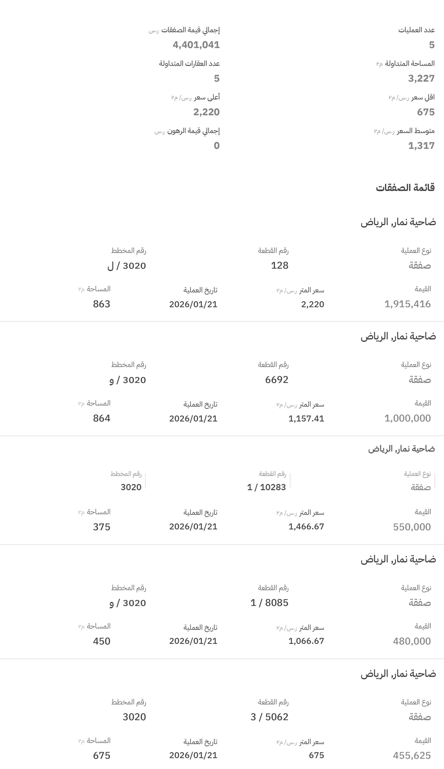 سجّلت مخططات نمار (3020) تنفيذ 5 صفقات عقارية، وجاء ترتيب أعلى ثلاث منها على النحو التالي: