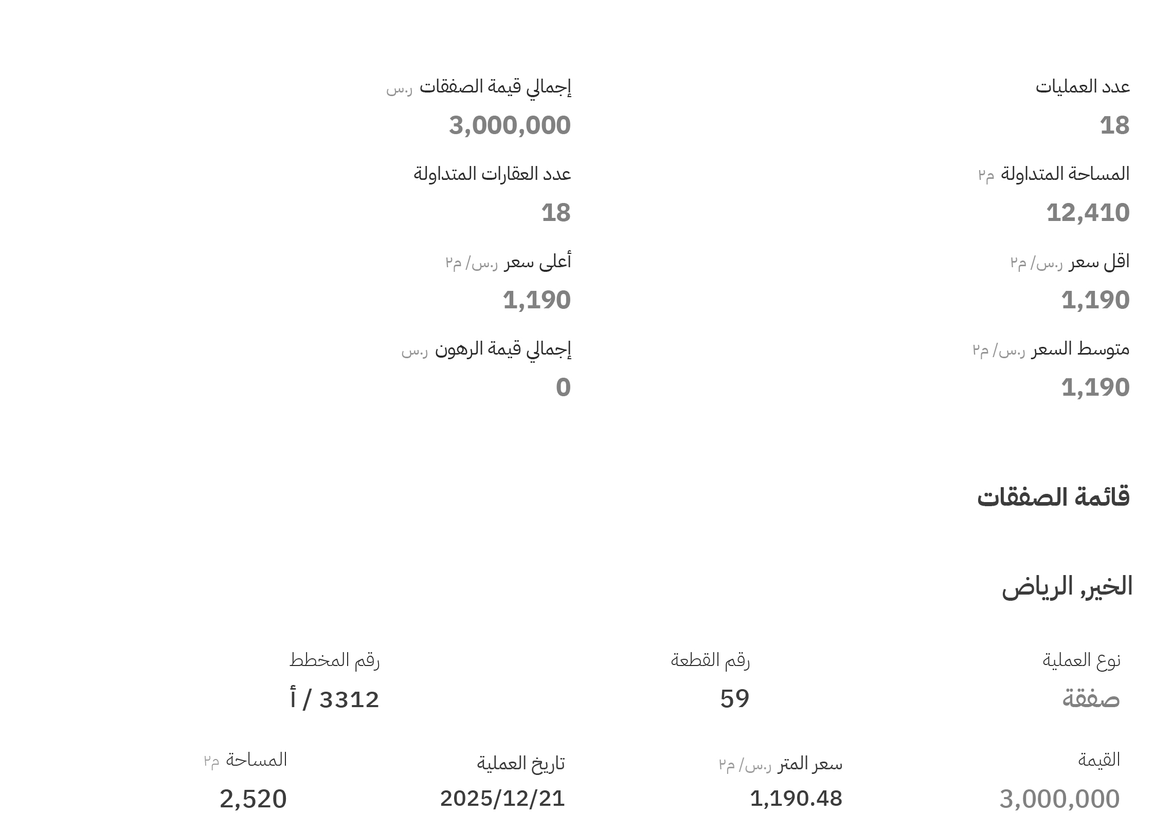 سجّل المخطط رقم (3312 / أ)، القطعة رقم (59)، أعلى سعر للمتر المربع عند 1190 ريالاً.