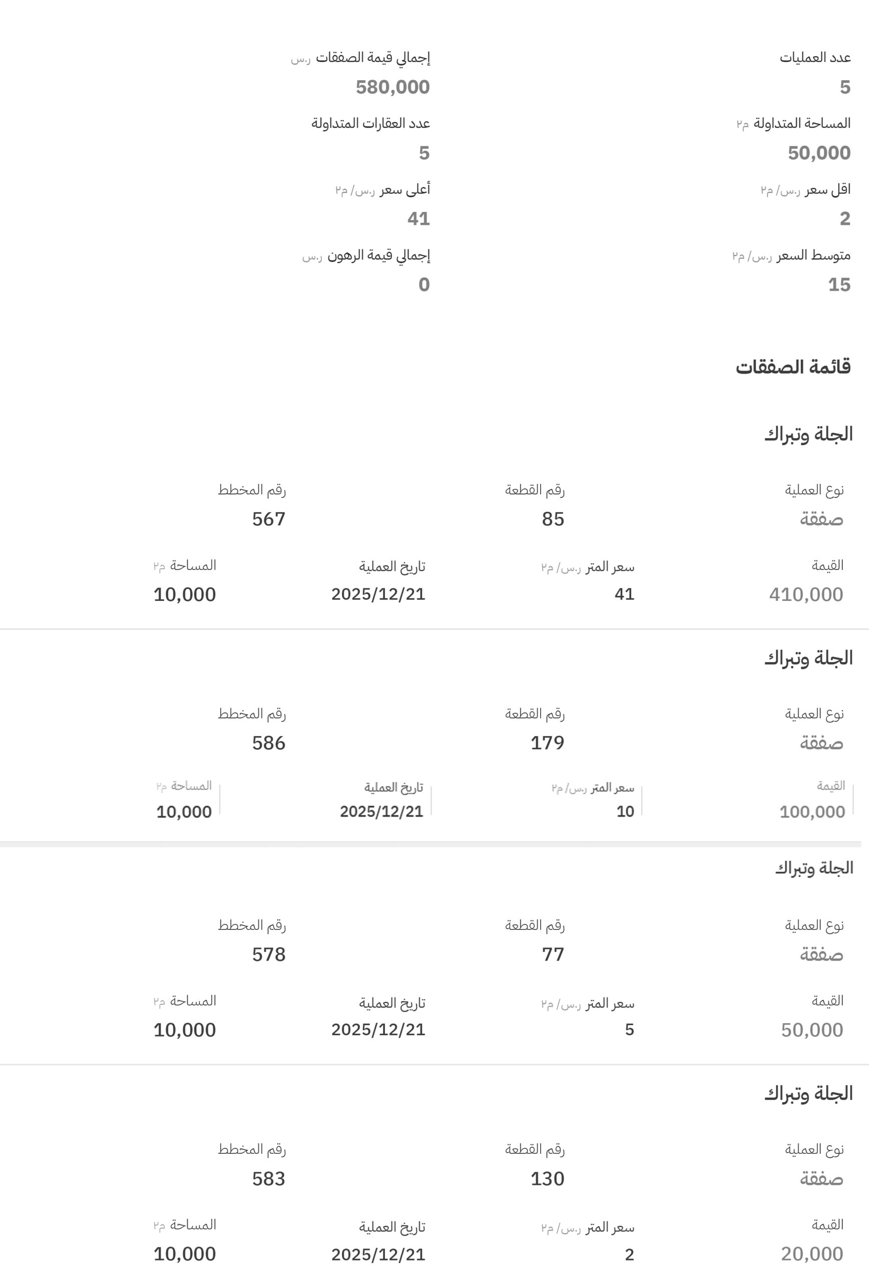 تصدّرت مخططات المزاحمية حركة التداول بتنفيذ 5 صفقات، حيث جاء ترتيب أعلى ثلاث منها على النحو التالي: